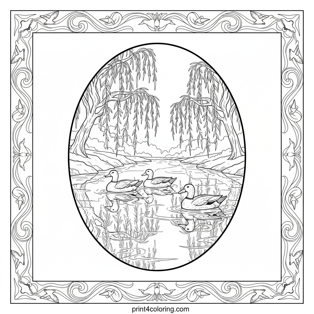 Dive into a tranquil scene where graceful ducks glide peacefully across calm waters, shaded by the elegant, drooping branches of majestic willow trees. Observe the beautiful reflections dancing on the water, inviting you to add vibrant colors to this serene natural masterpiece. A perfect page for a relaxing coloring adventure.