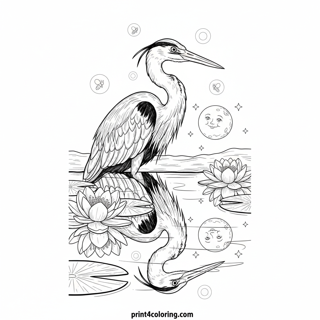 Step into a serene night scene with an elegant heron standing perfectly still in a tranquil, moonlit pond. Its reflection shimmers, surrounded by soft, glowing fireflies and beautiful water lilies with luminous petals. A friendly moon and distant stars complete this peaceful portrait, inviting your colors.