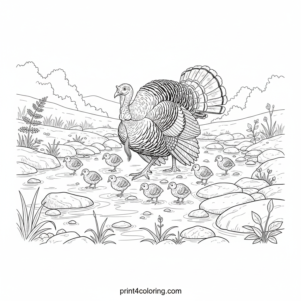 Join a magnificent hen wild turkey as she guides her adorable poults across a sun-drenched, rocky stream! This detailed scene invites you to color each feather, the smooth stones, and the delicate plants along the water's edge, bringing this peaceful family moment to life.