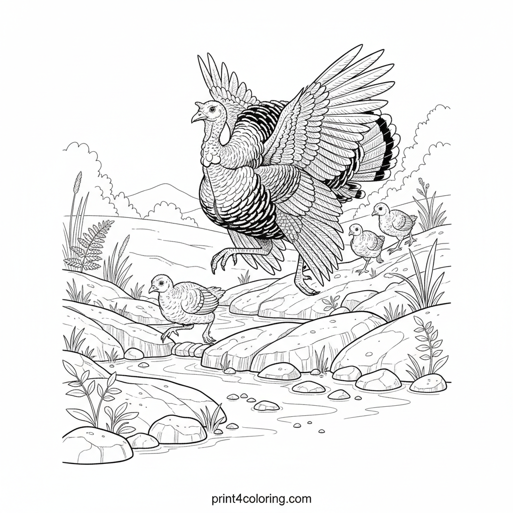 Join a brave hen wild turkey as she guides her adorable poults across a sparkling, rocky stream! Imagine the sun warming their feathers and the smooth stones beneath their tiny feet. This detailed scene invites you to bring the vibrant colors of nature to life, from individual feathers to lush riparian plants along the water's edge.