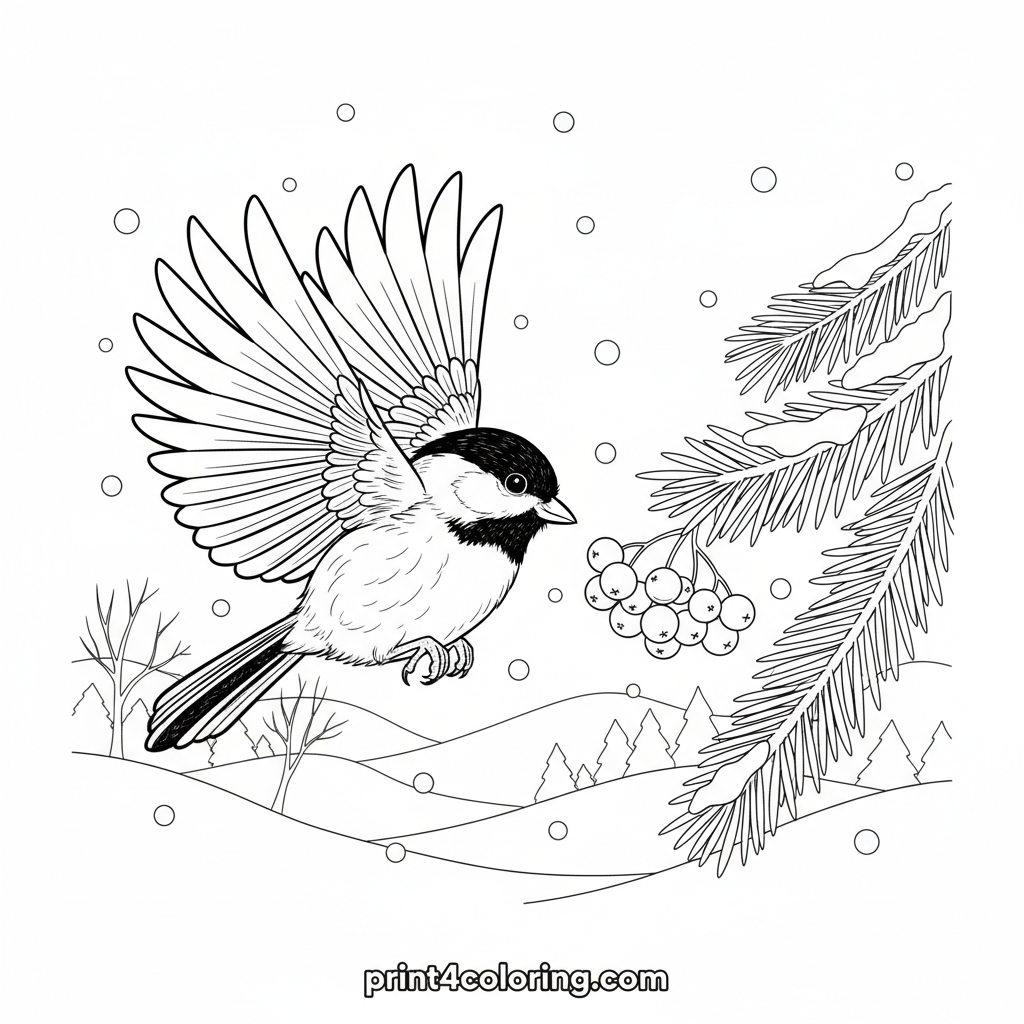 Imagine a tiny chickadee frozen mid-air, its delicate wings spread wide, ready to land! This detailed scene captures the bird's graceful flight towards vibrant red winter berries nestled on a snow-dusted evergreen branch. Get ready to bring this beautiful winter moment to life with your colors.