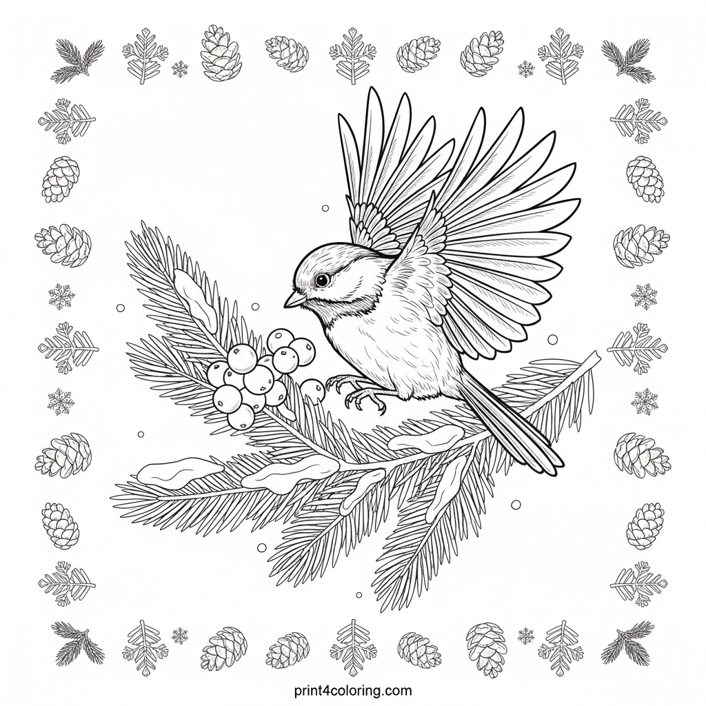 #chickadee#bird#winter#berries#nature#evergreen#snow#flight#coloring-page#printable