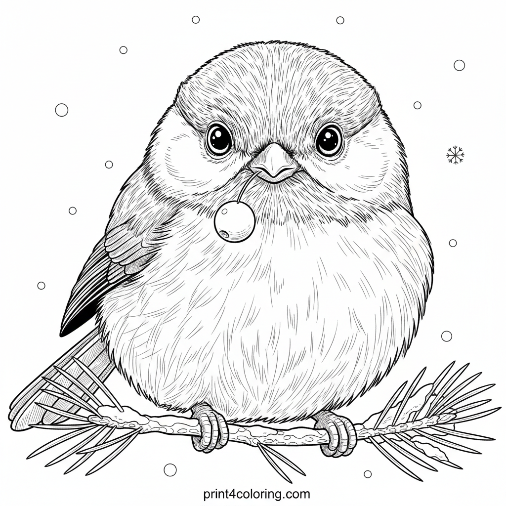 Explore a charming close-up of a plump, fluffy chickadee! Perched gently on a snow-dusted pine branch, its large, observant eyes sparkle. A single vibrant red berry adds a cheerful pop of color to this cozy winter scene, inviting you to bring it to life with your brightest hues.