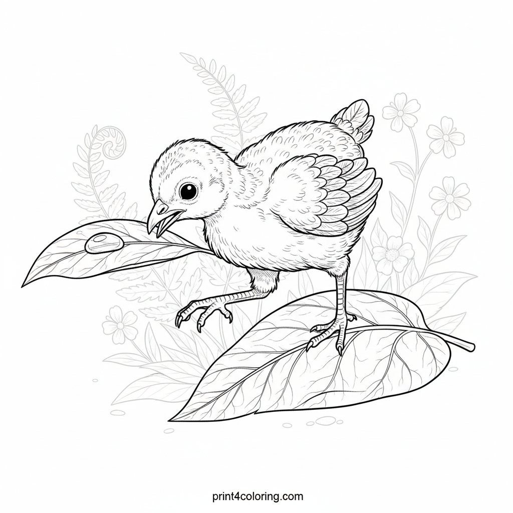 Join a fluffy young peachick on an exciting adventure! Watch as it curiously pecks at a sparkling dewdrop on a giant, detailed leaf. Explore a background filled with soft ferns and tiny wildflowers, all waiting for your creative colors. A delightful scene for budding artists!