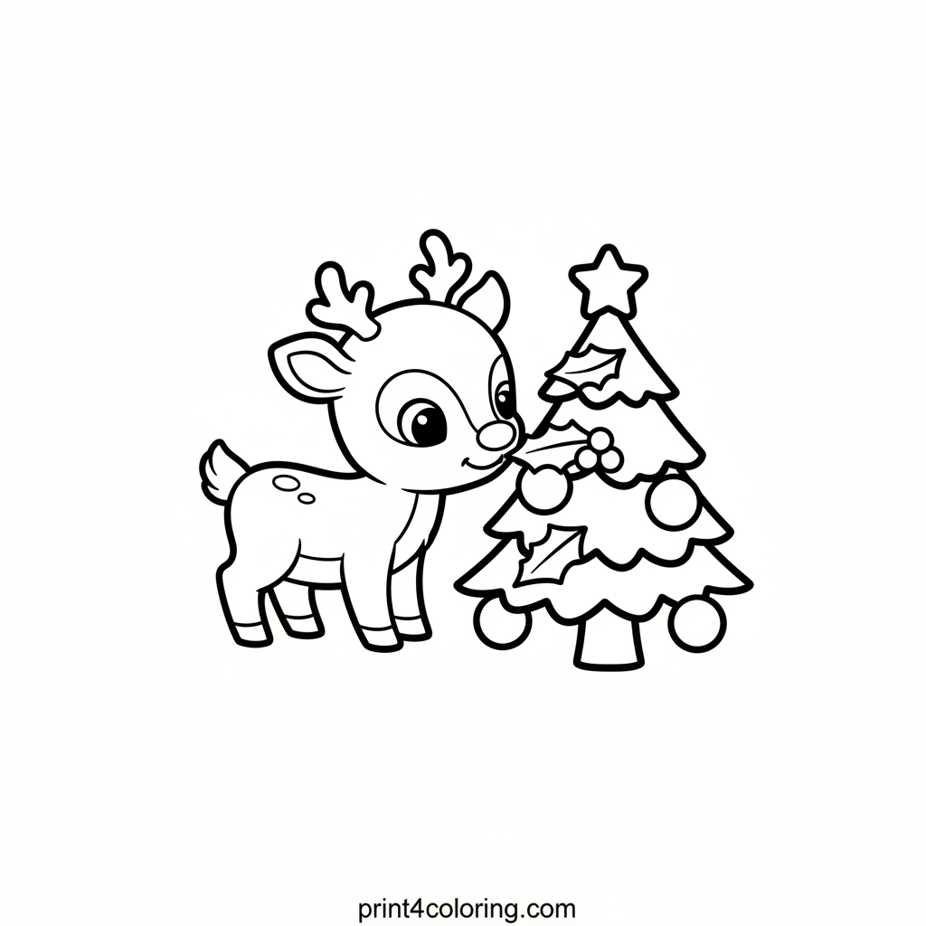 Baby Reindeer's Christmas Tree Sniff Coloring Page