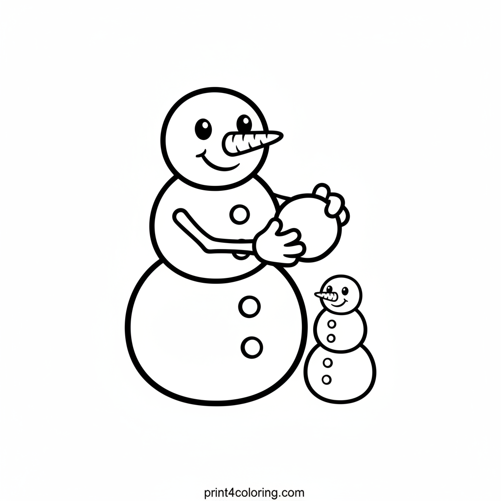 Join our big friendly snowman as he carefully builds a tiny baby snowman! This adorable scene is perfect for young children ages 3-7, offering simple shapes and a heartwarming moment to color. Grab your crayons and bring this snowy family to life with bright, cheerful colors. It's a wonderful way to celebrate winter fun!