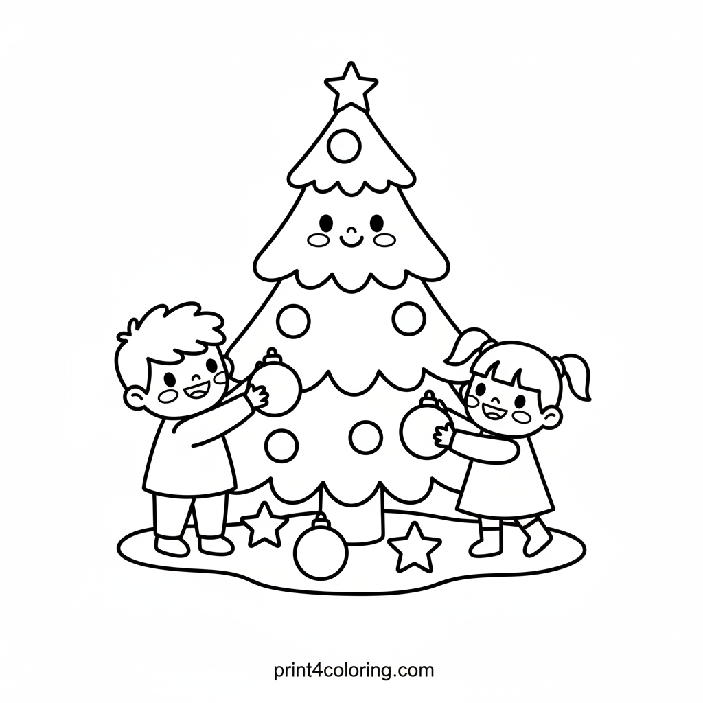 Join two happy children as they joyfully decorate a big Christmas tree with colorful, round ornaments! This delightful scene is perfect for young artists ages 3-7 to add their own holiday cheer. Grab your crayons and make this festive tree shine bright with your favorite colors!