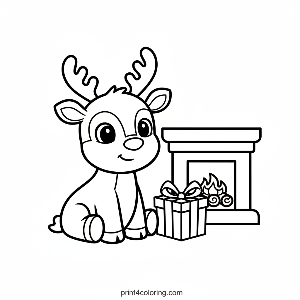 Snuggle up with this adorable coloring page featuring a happy reindeer enjoying a cozy spot by a warm fireplace. A big, beautifully wrapped present sits nearby, waiting to be colored! This charming scene is perfect for young children ages 3-7 to explore their creativity and bring festive cheer to life.