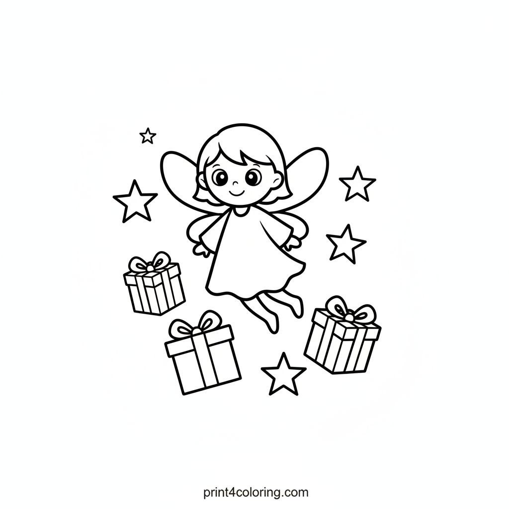 Join a tiny, friendly fairy as she delivers a magical collection of twinkling, floating Christmas presents! Each gift sparkles with little stars, making this an enchanting scene. This easy coloring page is perfect for young children ages 3-7, inviting them to add their favorite festive colors to this wondrous holiday moment.