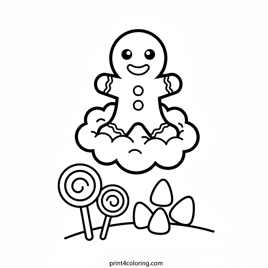 Join a happy gingerbread man as he floats on a fluffy marshmallow cloud high above a magical Candy Land! This delightful scene is filled with giant lollipops and yummy gummy drops, just waiting for your colors. Perfect for young children ages 3-7, this easy coloring page promises a sweet adventure.