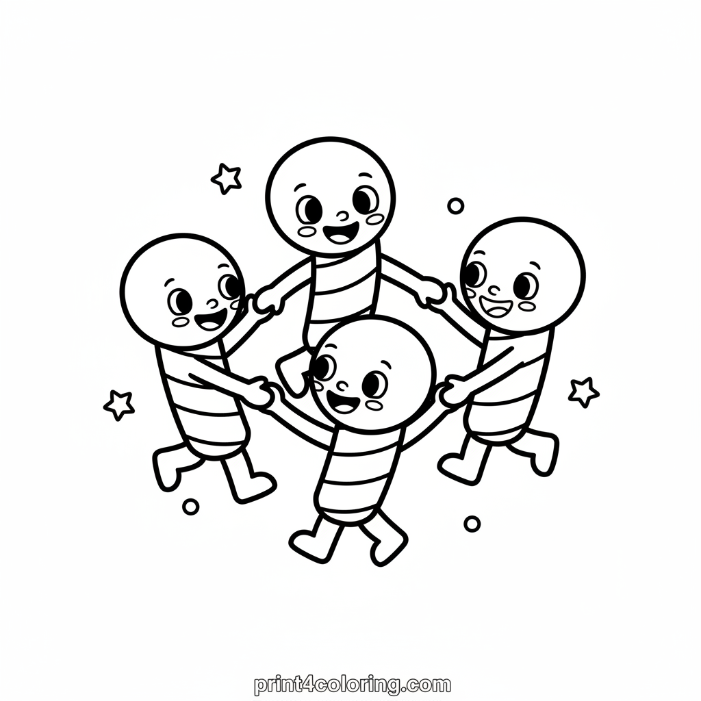 Join three joyful candy cane friends as they hold hands and dance in a happy, simple circle! This delightful coloring page is designed with easy-to-color shapes and friendly characters, making it absolutely perfect for young children ages 3-7 to express their creativity and add a splash of color to a sweet celebration.
