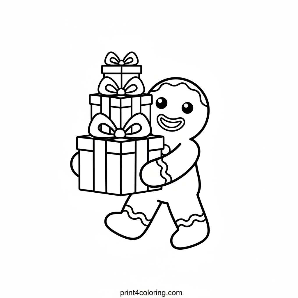 Join our super strong and smiling gingerbread man as he joyfully delivers a big stack of colorful Christmas presents! With simple shapes and big bows, this festive scene is perfect for young children ages 3-7 to color and celebrate the holiday spirit. Get ready to add your favorite colors to this sweet holiday helper!