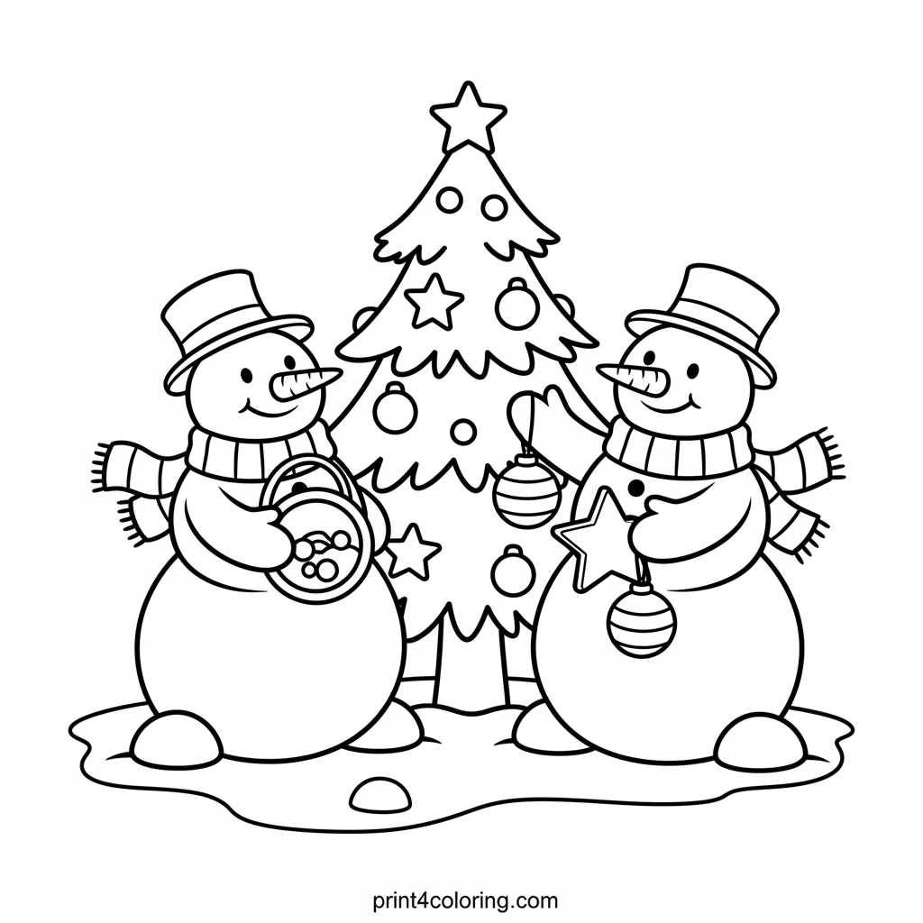 Happy Snowmen Decorate a Christmas Tree! Coloring Page
