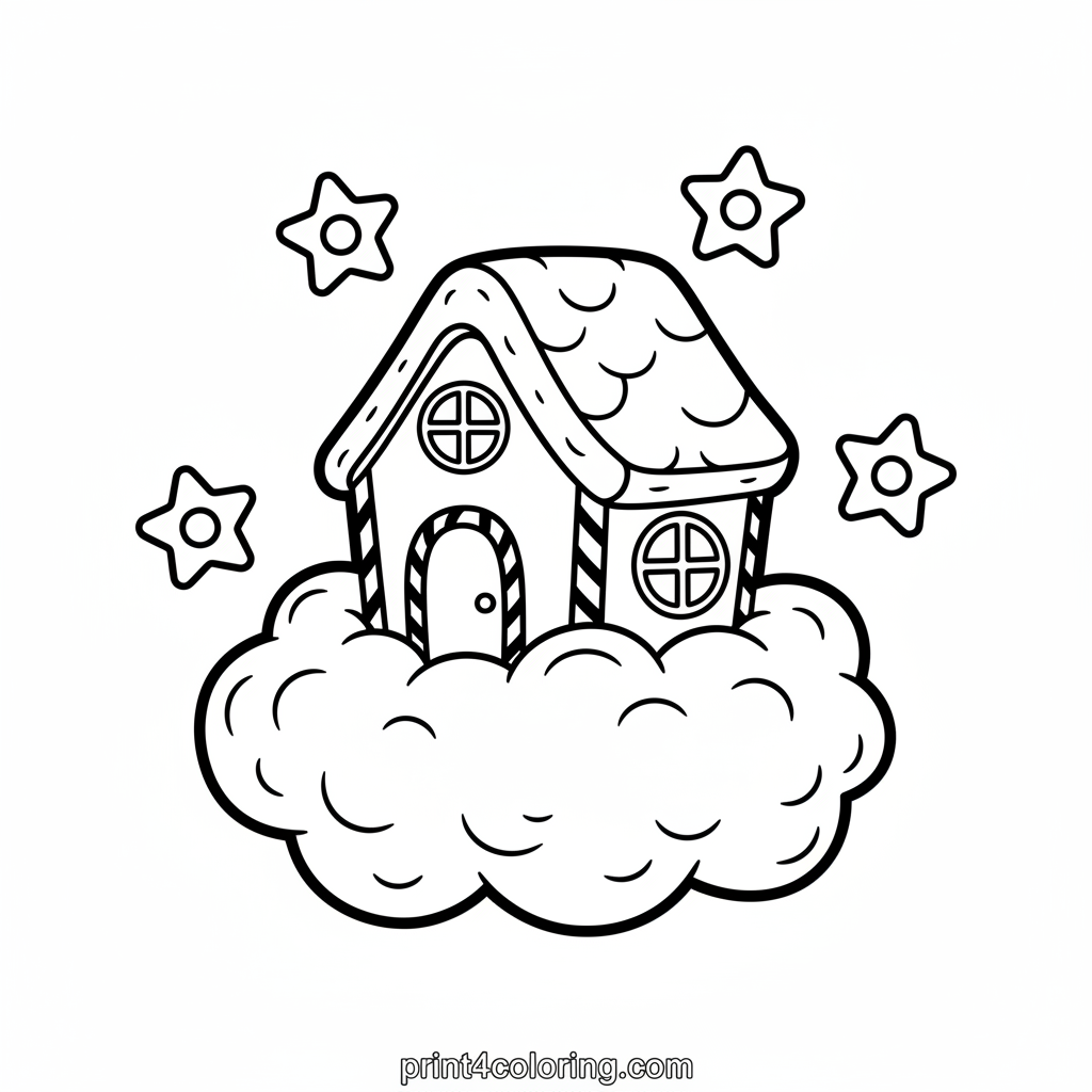 Imagine a super sweet gingerbread house floating high in the sky on a giant, fluffy cotton candy cloud! Little star candies twinkle all around. This enchanting scene is perfect for young children ages 3-7 to explore their creativity and bring a world of sugary dreams to life with their favorite colors.