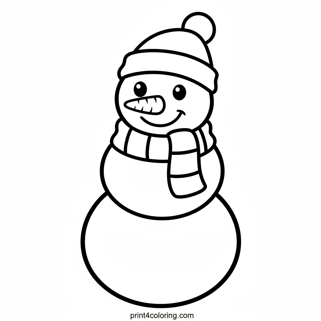 Get ready to color a cheerful snowman with a big, happy smile and kind eyes! He's wearing a cozy hat and a striped scarf, perfect for a winter day. This simple and fun coloring page is designed especially for young children ages 3-7, making it easy for little hands to create a colorful winter friend.