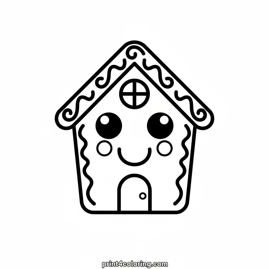 Get ready to color a super happy gingerbread house! This friendly home has big, round candy eyes, a cheerful smile, and is decorated with swirly frosting and colorful gumdrop buttons. It's an easy and delightful coloring adventure, perfect for young children ages 3-7 who love sweet treats and happy scenes.