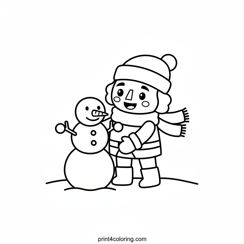 Join our friendly nutcracker in a whimsical winter wonderland! Bundled up warmly, he's busy building a cheerful snowman with a carrot nose and twig arms. This delightful scene is perfect for young children ages 3-7 to color, encouraging creativity and fine motor skills with its simple, engaging design.