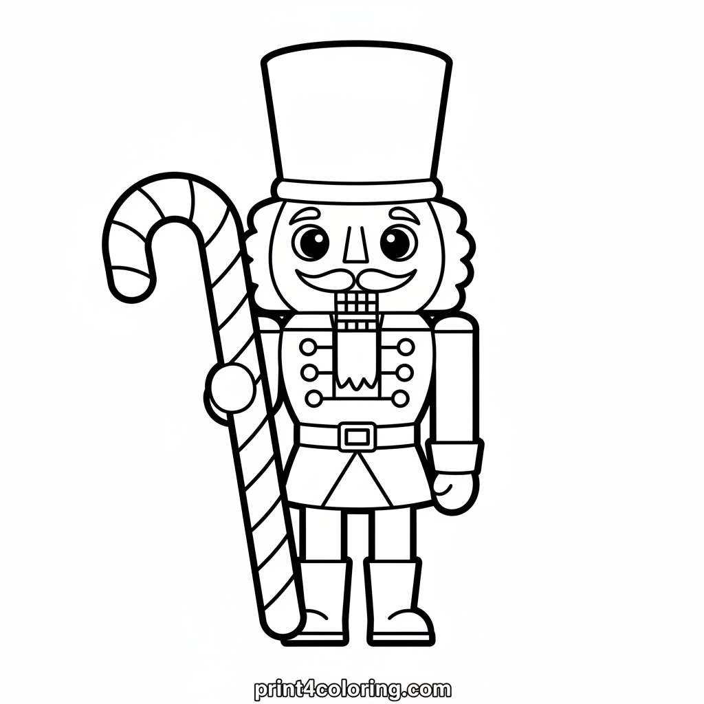 Meet our happy nutcracker, ready for a sweet adventure! He's holding a giant, swirly red and white candy cane, perfect for holiday fun. This easy coloring page is designed especially for young children ages 3-7, offering a delightful scene to color and spark their imagination.