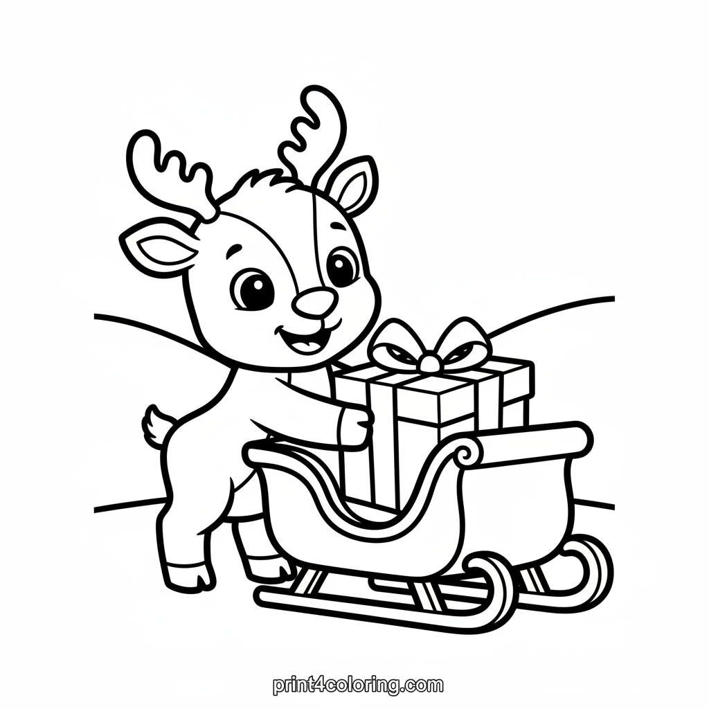 Join our friendly reindeer helper as they carefully nudge a big, colorful gift onto Santa's sleigh! This adorable scene is perfect for young children ages 3-7 to color, bringing the magic of Christmas to life with simple shapes and a heartwarming moment. Get ready for some festive coloring fun!