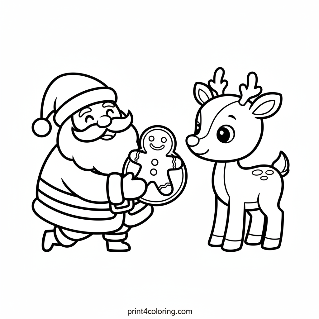 Join a very round and happy Santa Claus as he shares a giant gingerbread cookie with a sweet, smiling baby reindeer! This heartwarming scene is perfect for young children ages 3-7, offering simple shapes and a joyful moment to color. Get ready to add vibrant colors to Santa's suit and the yummy cookie!