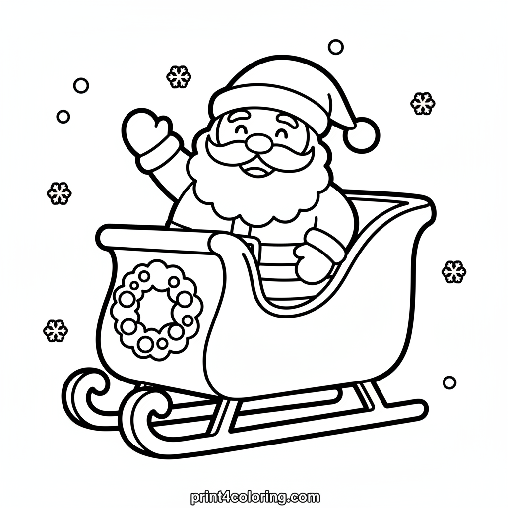 Get ready for a magical coloring adventure with Santa Claus! This delightful page shows Santa in his grand sleigh, waving a friendly hello, with a beautiful Christmas wreath adorning the front. It's an easy and fun scene, perfect for young children ages 3-7 to bring to life with their favorite colors this holiday season.