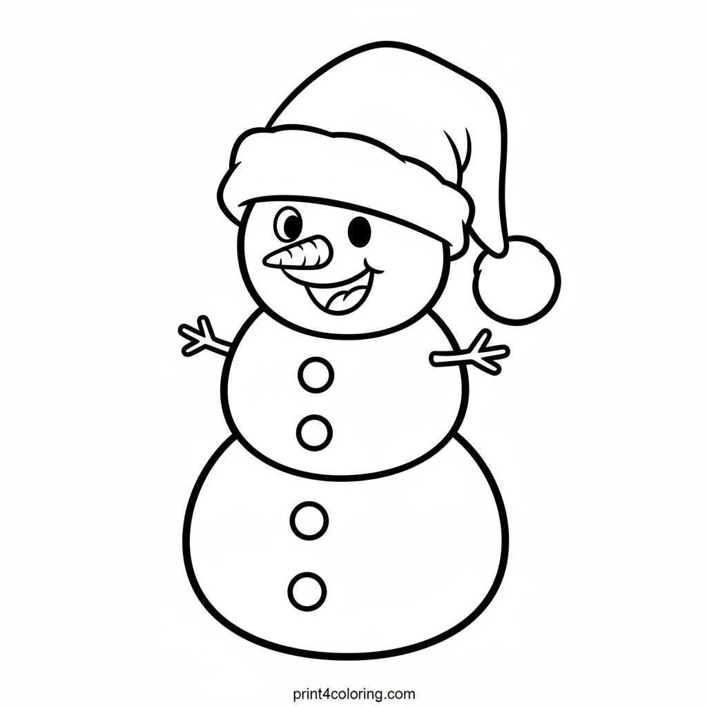 Meet our adorable snowman, looking surprised and giggly under a giant, floppy Santa hat that's much too big! One eye is playfully covered, adding to the fun. This easy coloring page is perfect for young children ages 3-7 to explore colors and create a festive, silly scene. Get ready for some winter coloring joy!