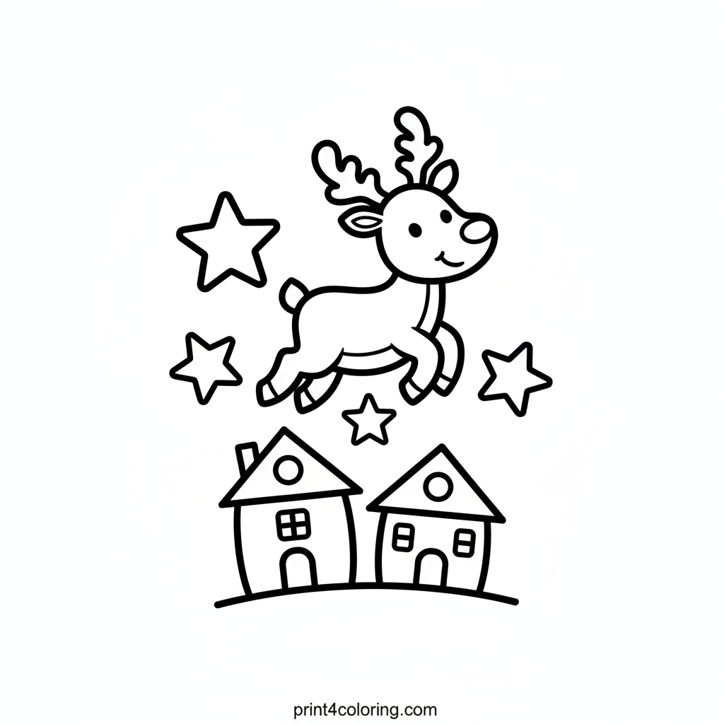 #reindeer#stars#flying#christmas#winter#magic#holidays#houses#easy#coloring-page#printable