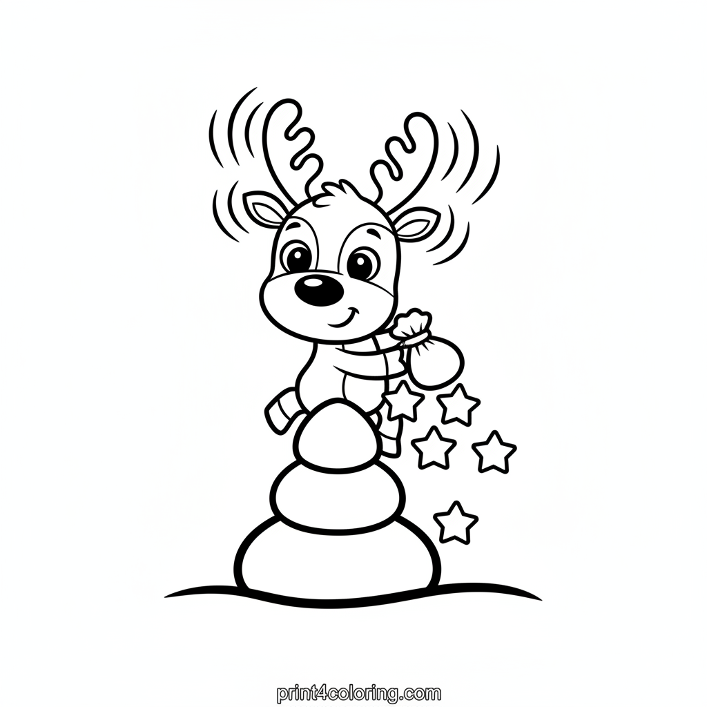 Get ready for a magical winter adventure with our adorable Sparkle Reindeer! This friendly reindeer has gently glowing antlers and is sprinkling simple star-shaped magic dust over a cozy, snowy tree. It's a perfect scene for young children ages 3-7 to explore colors, imagination, and the joy of the season. Grab your crayons and let the magic begin!