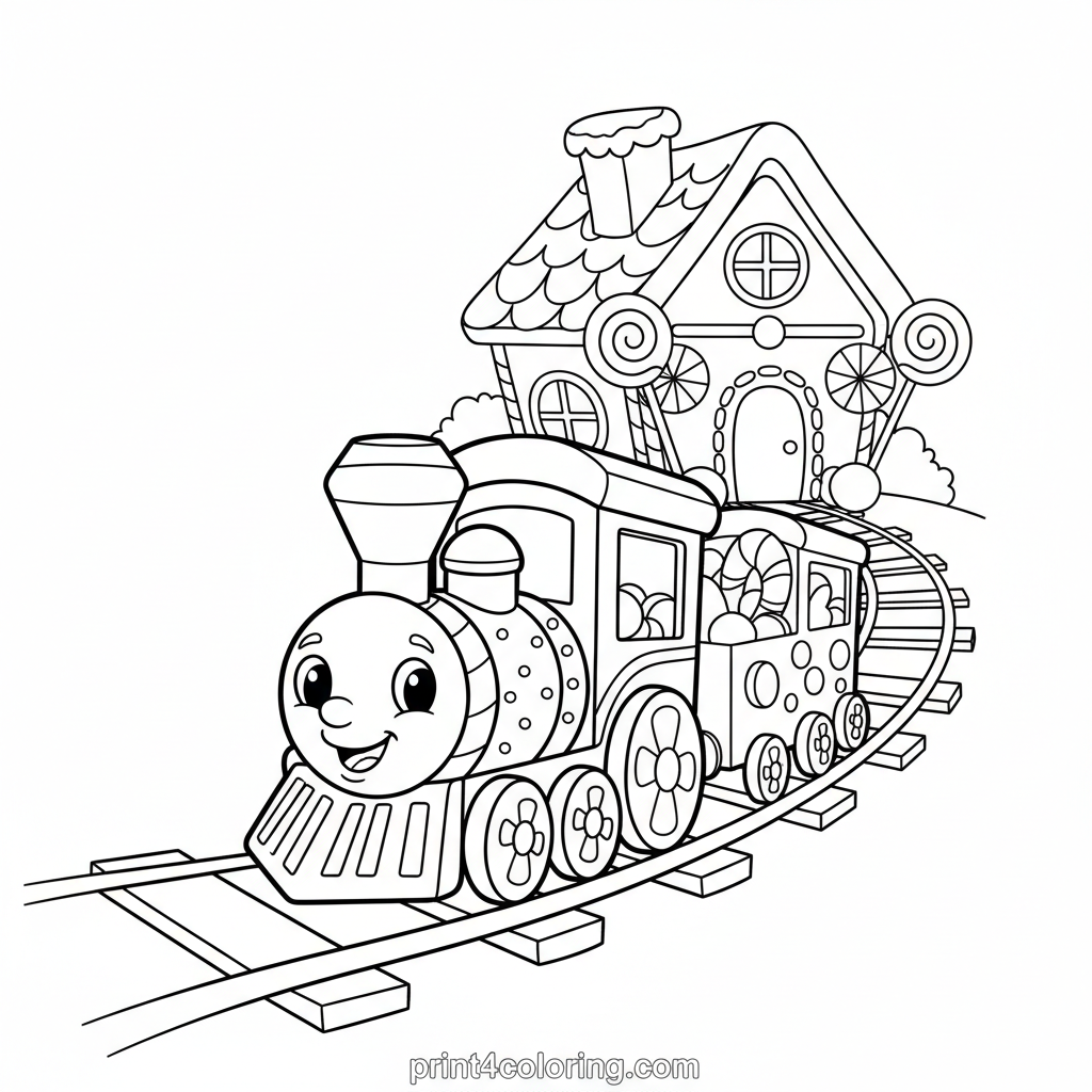 All aboard for a delicious journey! This cheerful candy train, made of yummy treats, is chugging around a cozy gingerbread house. Perfect for young children ages 3-7, this easy coloring page invites little artists to add their favorite colors to a delightful scene of sugary fun. Get ready to imagine a world made of sweets!