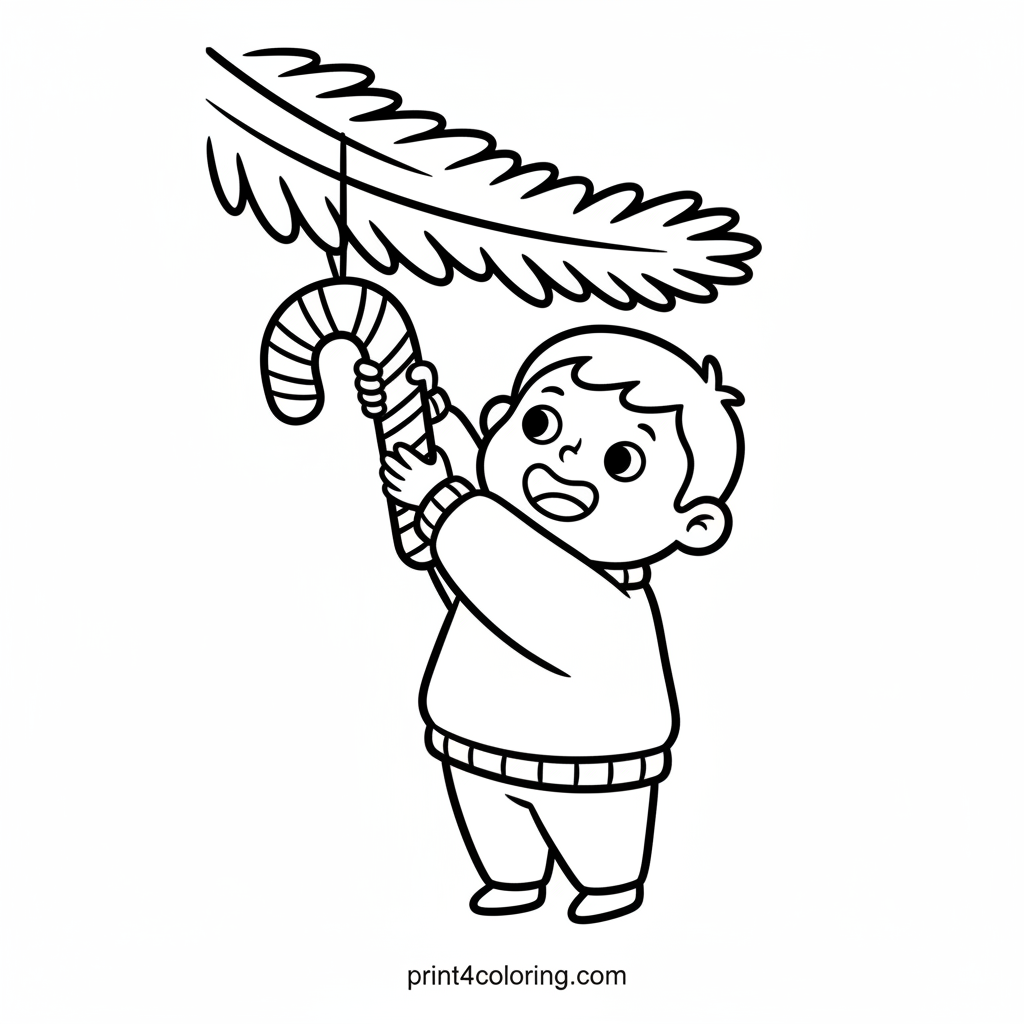 Join a happy child as they carefully hang a yummy candy cane on a big, simple Christmas tree branch! This delightful coloring page captures the joy of holiday decorating, perfect for young children ages 3-7. Little ones will love adding festive colors to the child's smile, the candy cane, and the cozy tree. Get ready for some sweet holiday fun!
