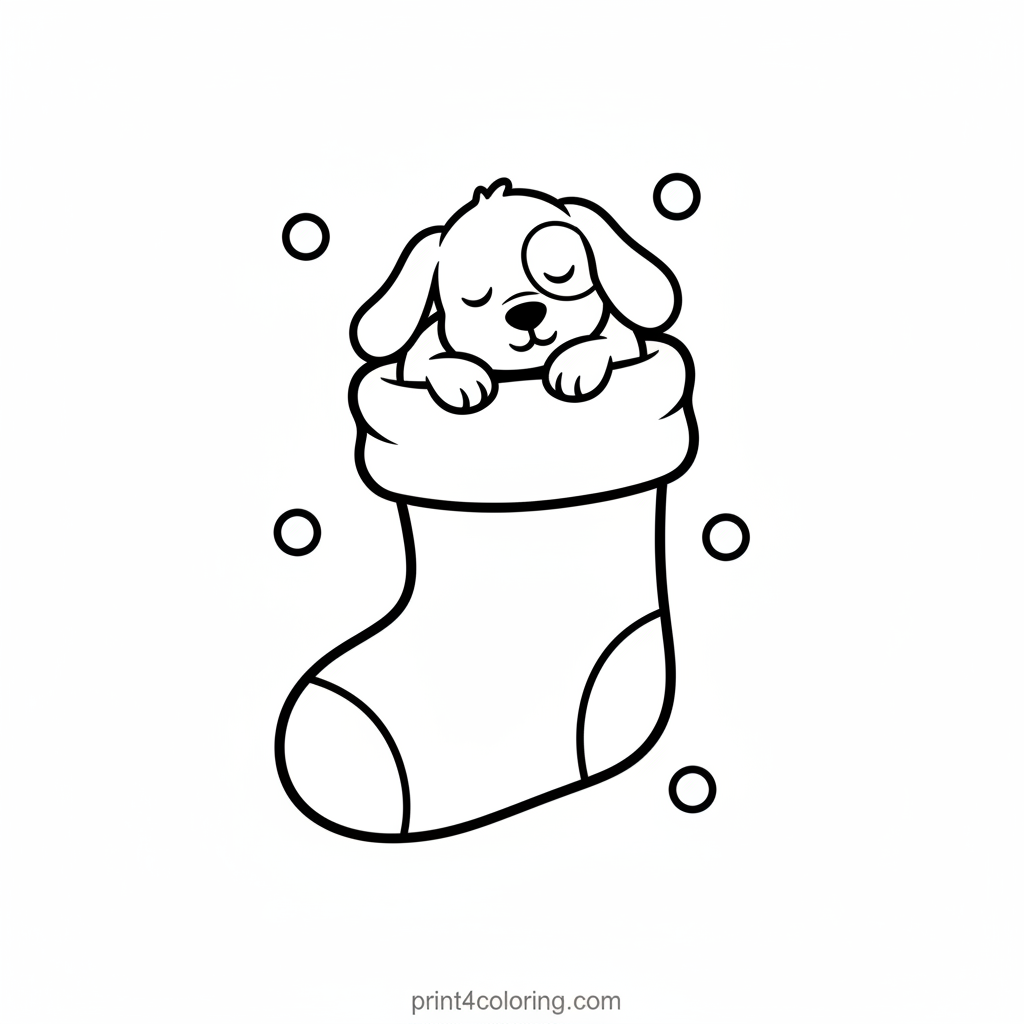 Snuggle up with this adorable coloring page! A tiny, sleepy puppy with big, soft ears is curled up fast asleep inside a very large, soft Christmas stocking, dreaming sweet, happy dreams. This heartwarming scene is perfect for young children ages 3-7 to color, bringing festive cheer and gentle fun.