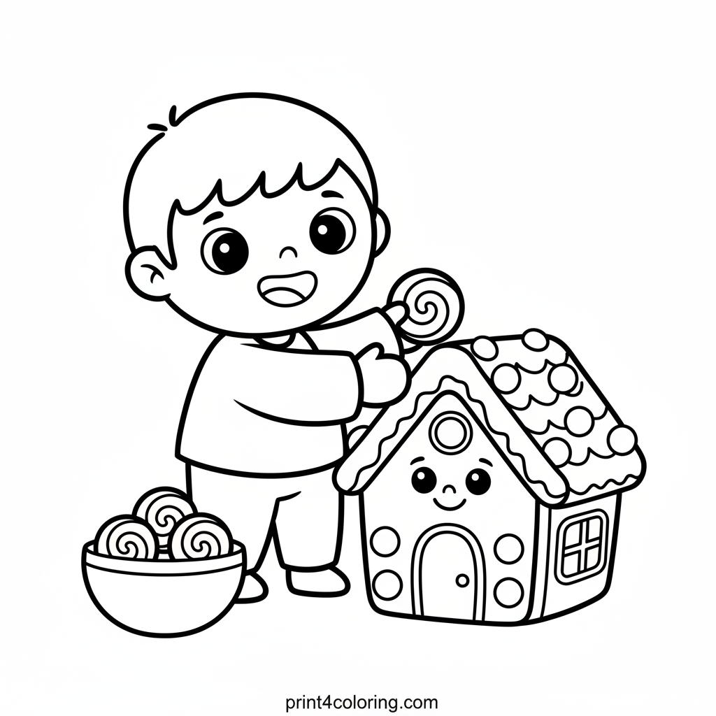 Join a happy child as they decorate a cheerful gingerbread house with yummy candies! This delightful coloring page is perfect for young children ages 3-7, encouraging creativity and fine motor skills. Little hands will love adding bright colors to the sweet treats and the smiling house. Get ready for some sugary coloring fun!