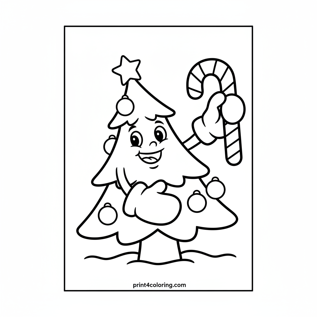 Get ready for some giggles with this funny coloring page! A cheerful Christmas tree, wearing big, cozy mittens, is having a bit of a challenge trying to hang a giant candy cane. This adorable scene is perfect for young children ages 3-7 to explore colors and enjoy a sweet holiday adventure.