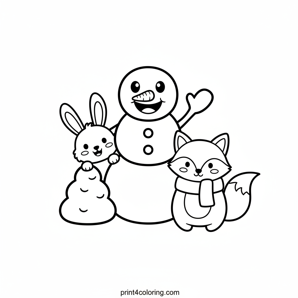 Join a friendly snowman as he waves hello to his adorable woodland friends! A cute fox in a cozy scarf and a fluffy bunny peeking from a snowy bush make this a delightful winter scene. Perfect for young children ages 3-7 to explore colors and imagination on a chilly day.