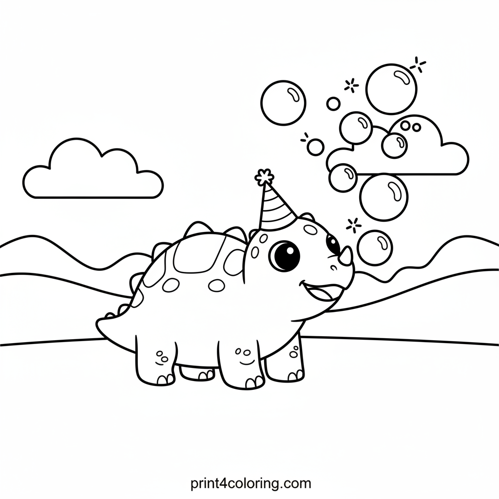 Get ready for a prehistoric party! This playful Ankylosaurus, sporting a cute party hat, is having a blast. Watch as it gently uses its famous club tail to pop giant, shimmering bubbles floating all around. Bring this joyful dino scene to life with your favorite colors and imagine the bubbly fun!