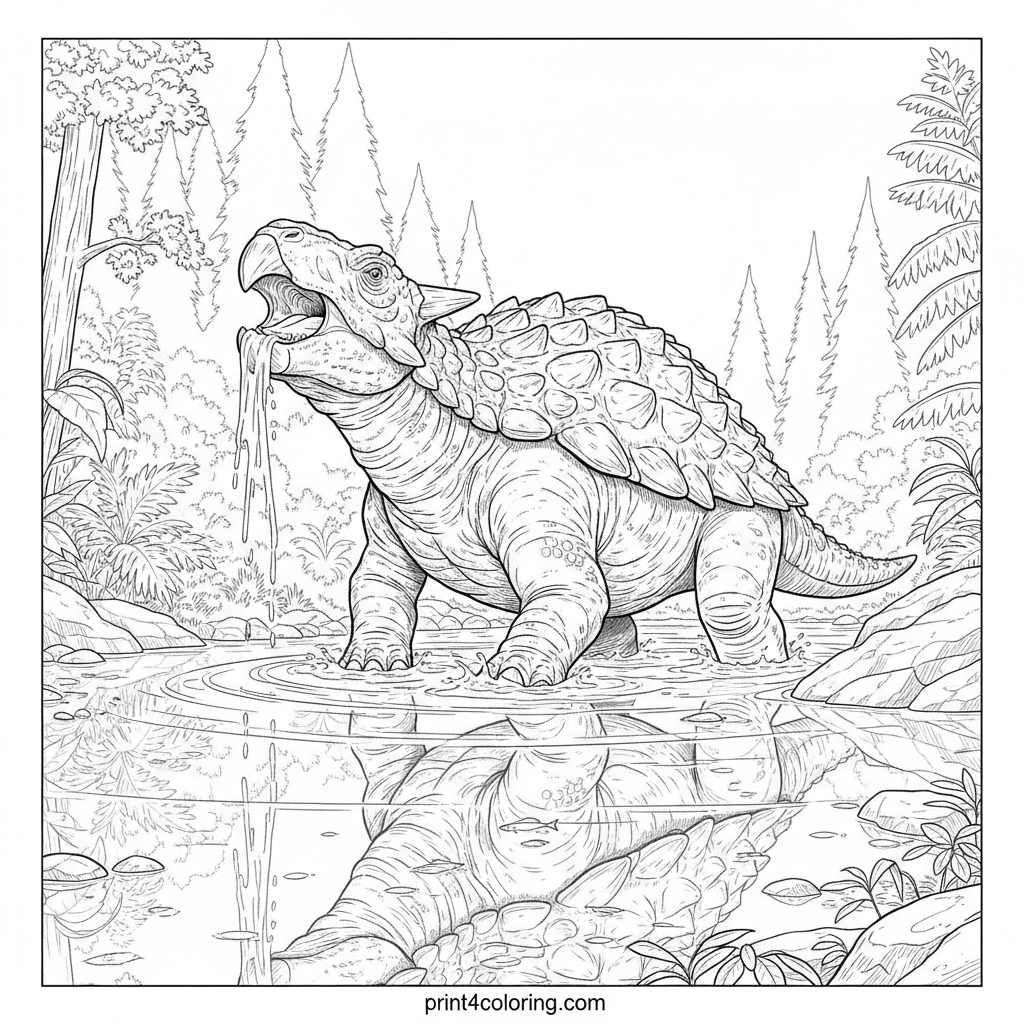 Journey back in time to color a magnificent Ankylosaurus as it sips from a calm prehistoric river. Admire the detailed reflections of its armored body and the vibrant plants on the riverbank. Look closely for tiny fish swimming beneath the surface, bringing this ancient world to life with your colors.