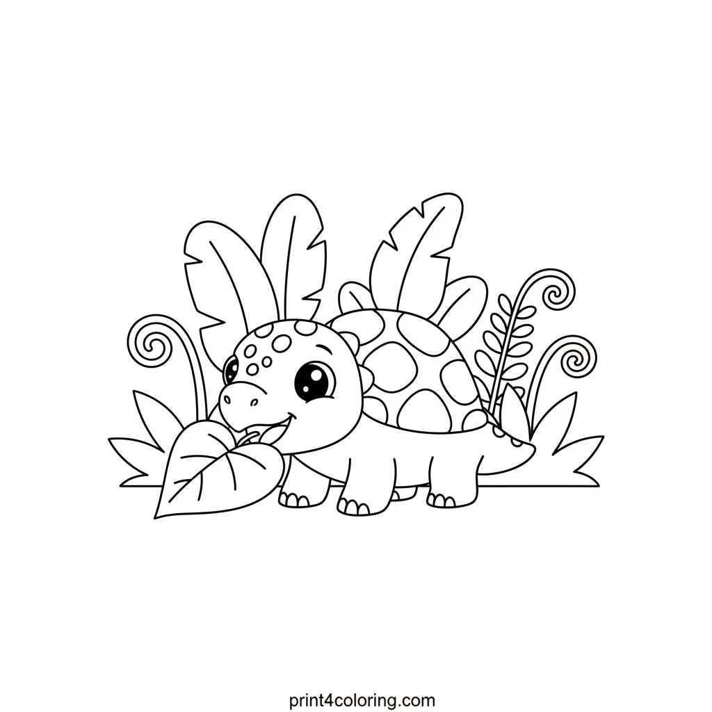 Meet a super cute baby Ankylosaurus enjoying a delicious leafy lunch! With big, friendly eyes, this little dinosaur is happily munching on a giant green leaf, surrounded by gentle jungle plants. Its bumpy back looks like a cozy hill. Get ready to add vibrant colors to this prehistoric scene!