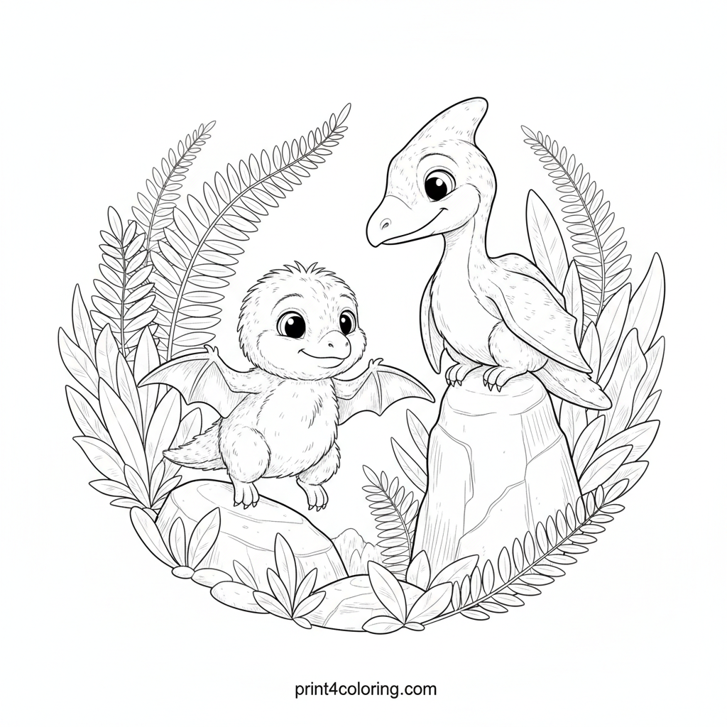 Watch a fluffy baby pterodactyl take its very first flight! With wide, curious eyes, it tentatively flaps its tiny wings as a gentle adult pterodactyl watches from a rocky perch. Lush prehistoric ferns fill the scene, creating a cozy and exciting moment to color.