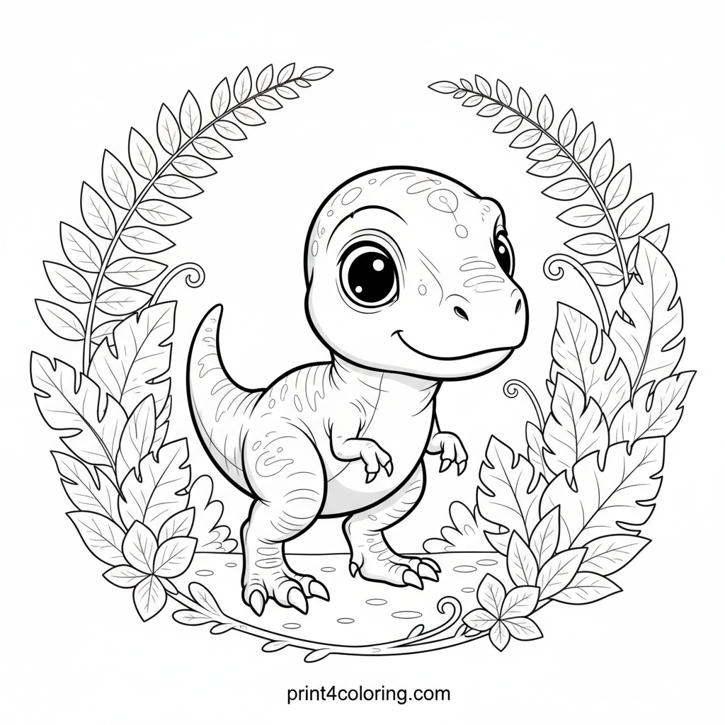 Join adorable Baby Rex on its very first adventure! This wobbly little Tyrannosaurus Rex explores a lush prehistoric world. With wide, curious eyes, it marvels at ancient ferns and exotic plants. Get ready to bring this heartwarming scene to life with your most vibrant colors!