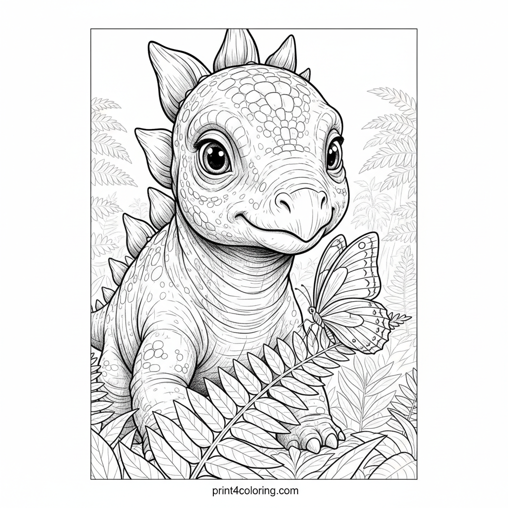 Embark on a prehistoric adventure with a curious baby Stegosaurus taking its first cautious steps! This detailed coloring page captures the young dinosaur's wonder as it encounters a beautiful, intricately textured butterfly perched on a giant leaf amidst a lush fern forest. Explore realistic scales and ancient flora in this exciting scene.