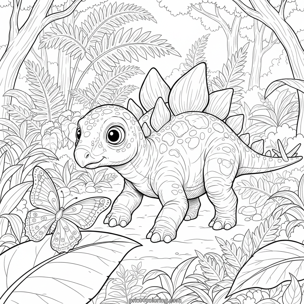 Join a wide-eyed baby Stegosaurus on its very first adventure! Explore a lush, ancient fern forest where our little dinosaur friend cautiously encounters a magnificent, intricately patterned butterfly resting on a giant leaf. Discover the wonders of a prehistoric world and bring this detailed scene to life with your colors.