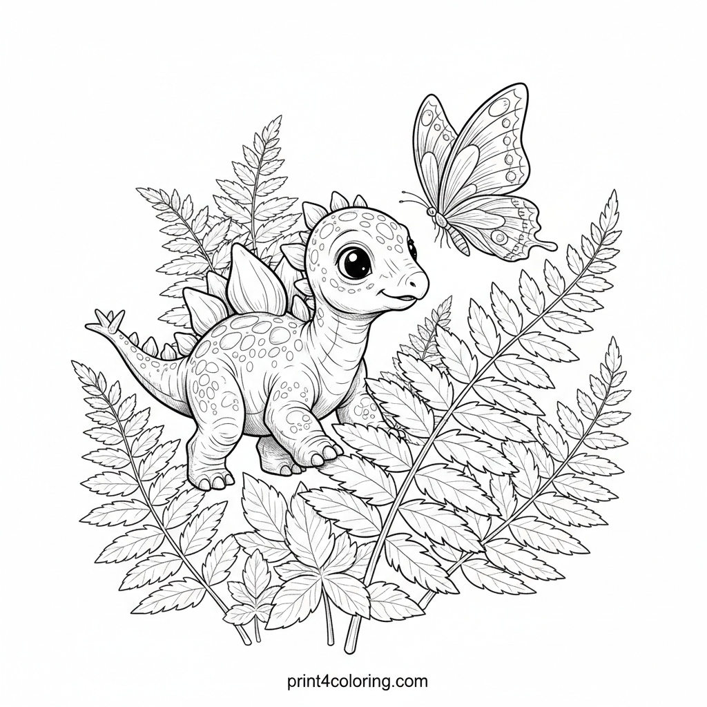A charming baby Stegosaurus with big, curious eyes takes its first cautious steps into a lush prehistoric fern forest. Watch as it encounters a magnificent, intricately patterned butterfly resting on a giant leaf. This expert-level page invites you to bring ancient textures and vibrant life to this enchanting scene.