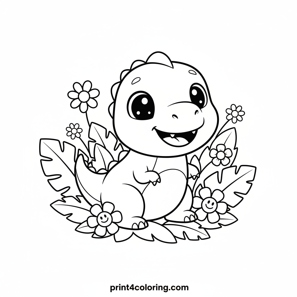 Meet the cutest little T-Rex you'll ever see! This adorable baby dinosaur has huge, friendly eyes and a big, happy smile, ready to brighten your day. He's sitting cozily amidst lush, rounded jungle leaves and surrounded by cheerful, simple flowers. Grab your crayons and bring this prehistoric pal to life with your favorite colors!