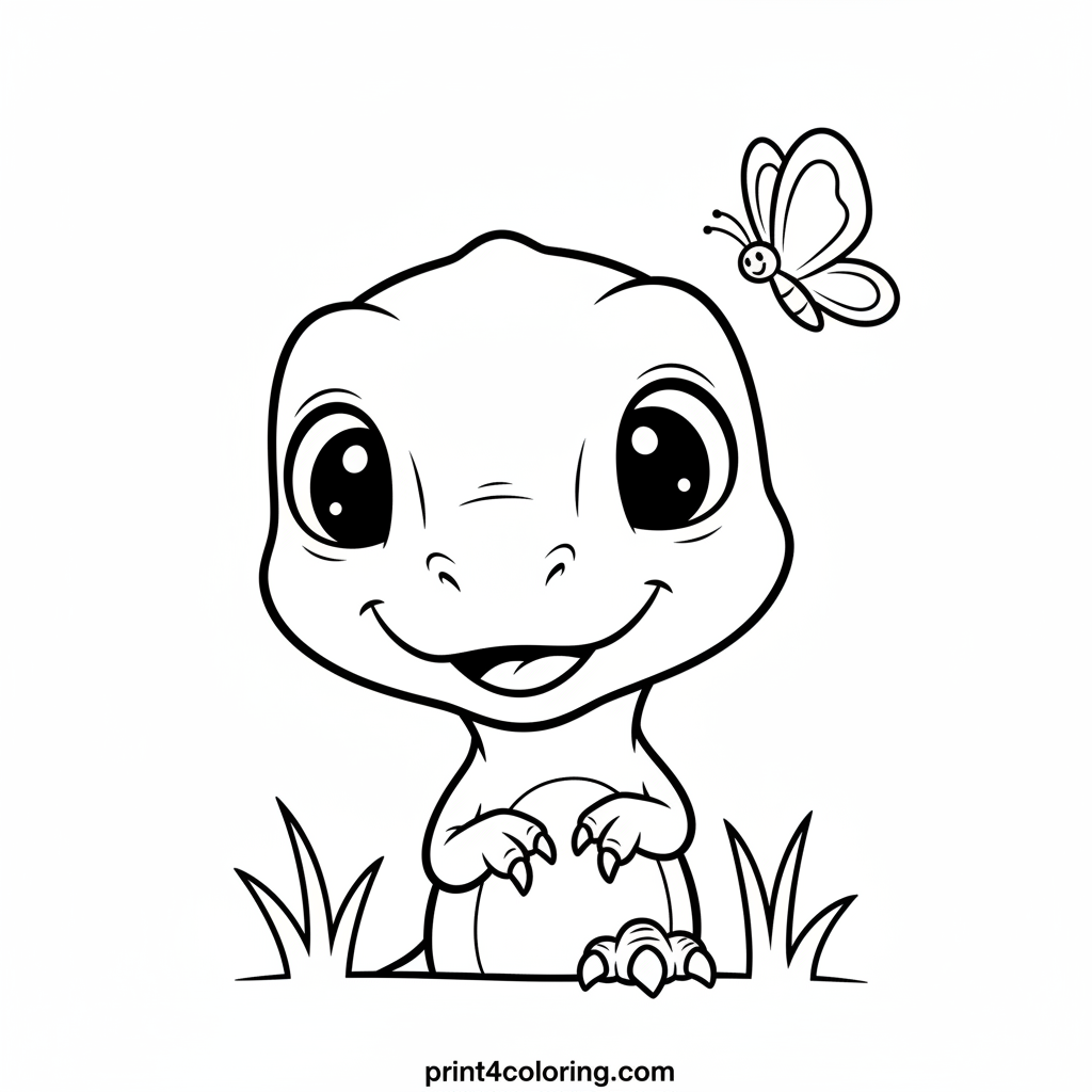 Join an adorable baby velociraptor hatchling as it takes its very first wobbly steps! With big, curious eyes, this tiny dino explores a sunny, grassy field. A friendly butterfly dances nearby, making this a heartwarming scene perfect for young paleontologists to color. Bring this prehistoric moment to life with your favorite crayons!