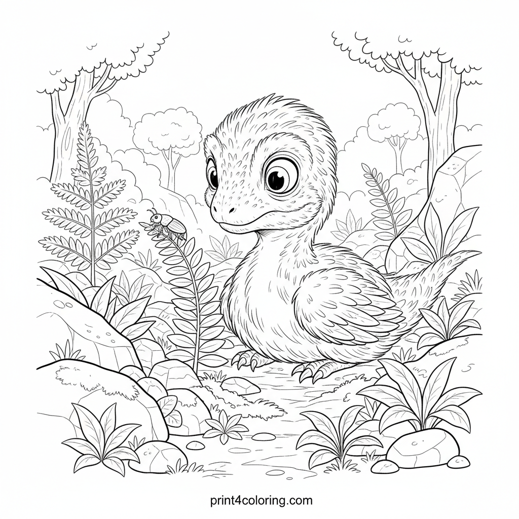 Step into a prehistoric world with this adorable baby Velociraptor! Watch as the curious chick, with its soft downy feathers, gazes intently at a tiny beetle. Surrounded by lush ferns and mossy rocks, this detailed scene invites you to bring the ancient past to life with your colors. A fascinating adventure awaits!