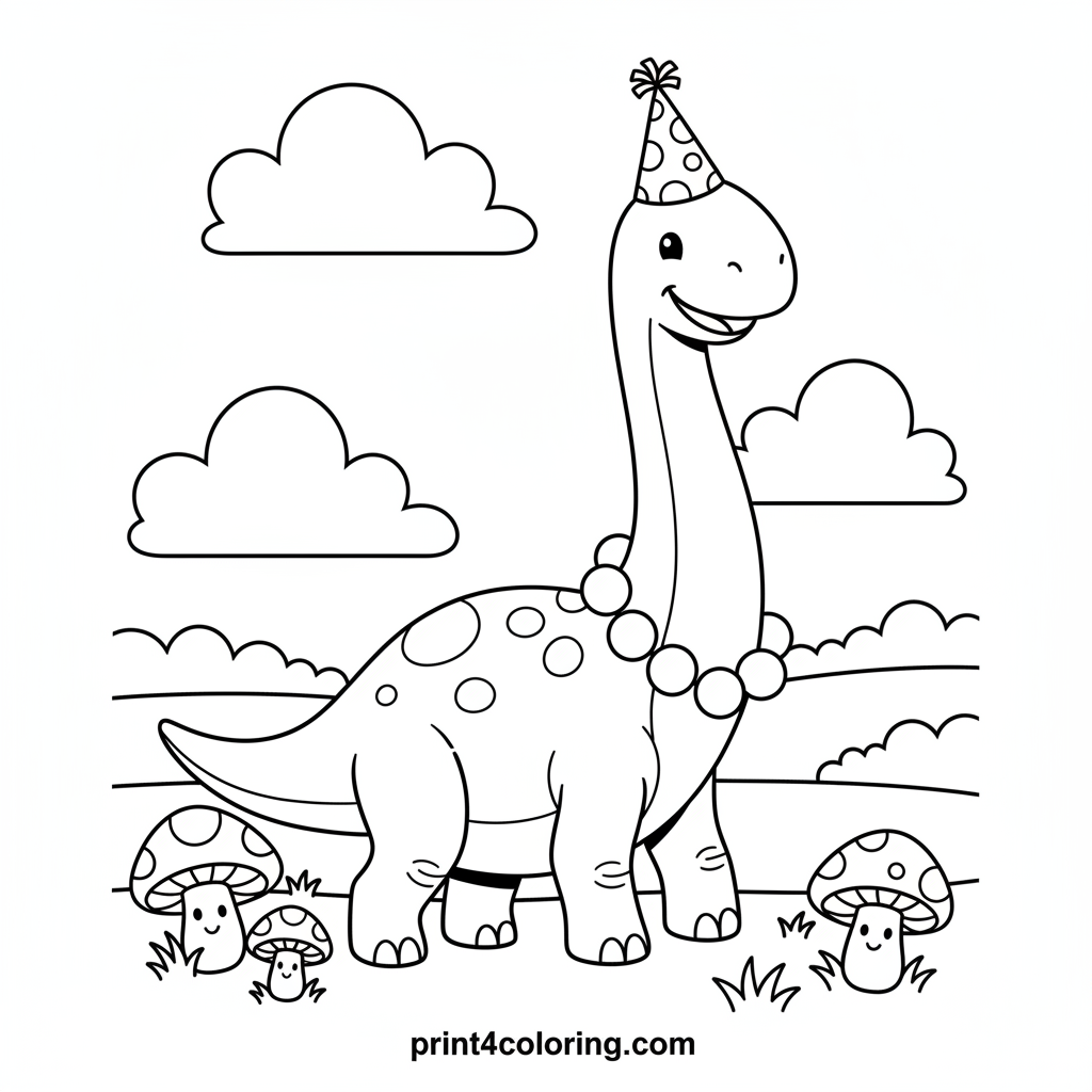 A happy Brachiosaurus parades through a field of smiling mushrooms! This gentle giant wears a silly party hat and has its long neck adorned with colorful, oversized beads. Imagine all the bright colors you can use to bring this joyful scene to life. Get ready to color a prehistoric party!