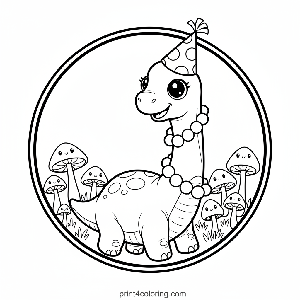 Join a friendly Brachiosaurus as it strolls through a magical field! This giant dinosaur is ready for a party, wearing a funny hat and a necklace of colorful beads. It's walking past happy, smiling mushrooms. Get ready to add vibrant colors to this cute and cozy prehistoric scene!