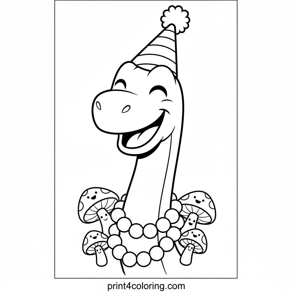Color a cheerful Brachiosaurus, proudly wearing a silly party hat and vibrant bead necklace! This gentle giant is strolling through a whimsical field of happy, smiling mushrooms. Bring this prehistoric parade to life with your favorite colors and make it the most festive scene ever!
