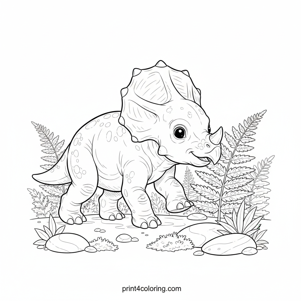 Curious Baby Triceratops Explores the Ancient Fern Forest Coloring Page