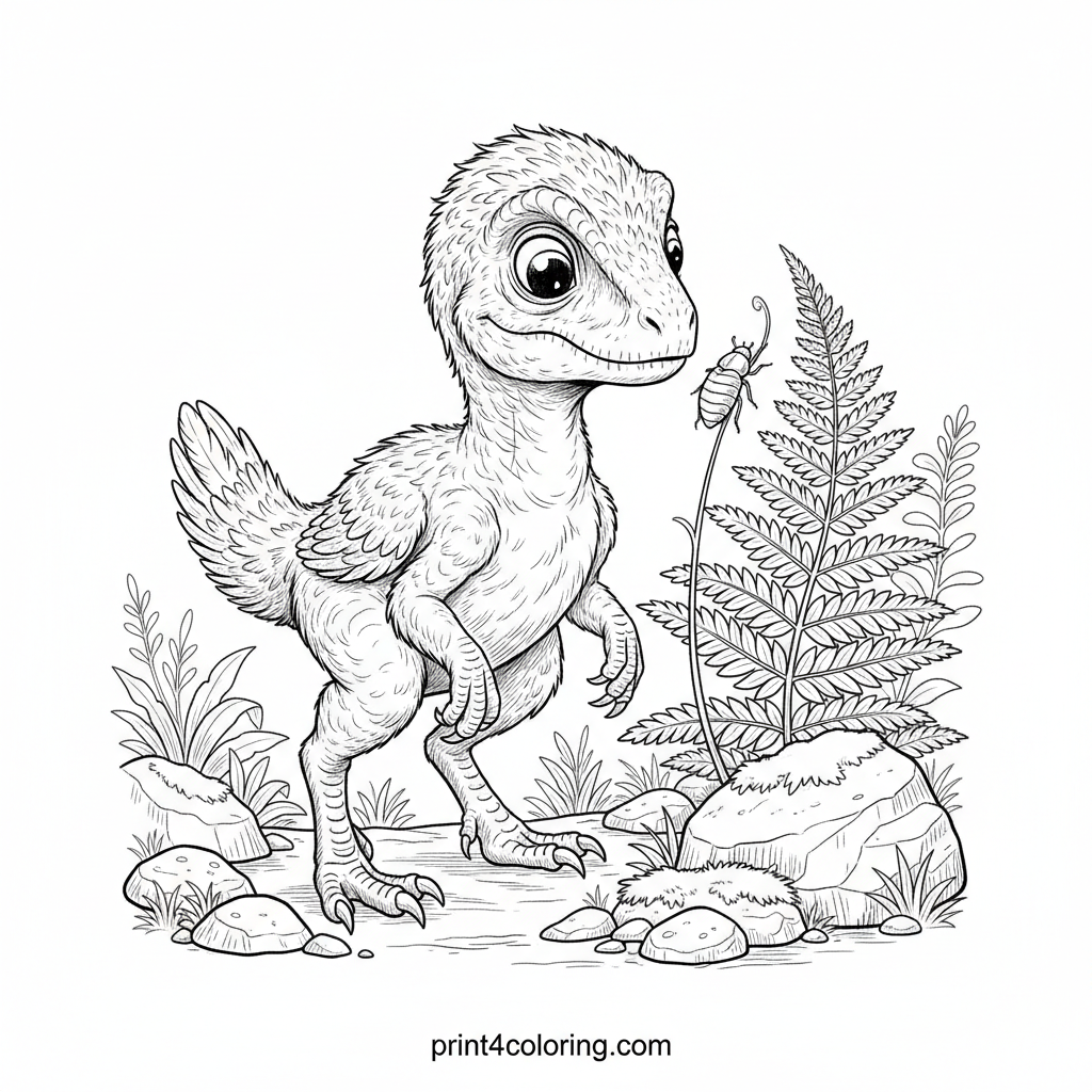 Curious Baby Velociraptor's Tiny Friend Coloring Page